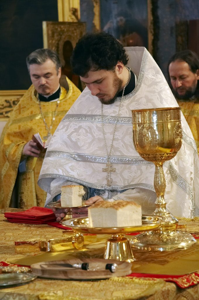 Перед возгласом «Святая святым» он возвращает Святой Хлеб архиерею».